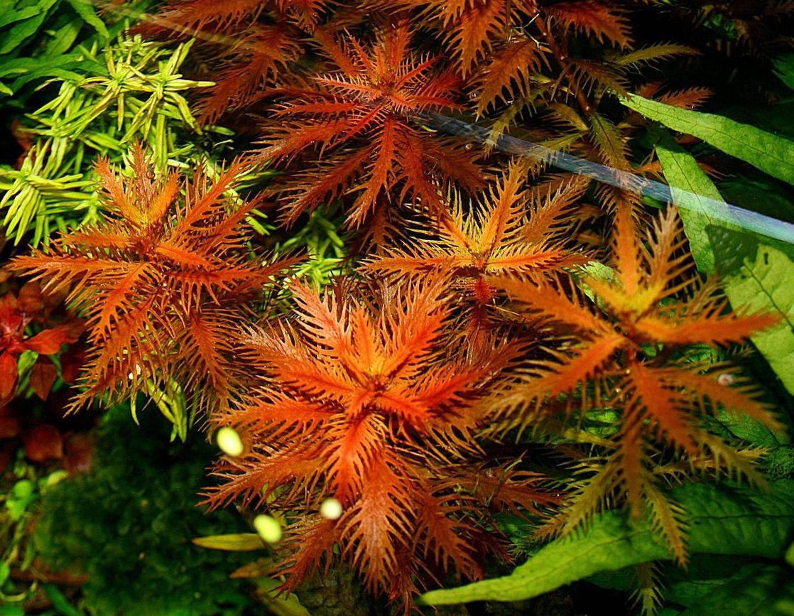 Прозерпинака (Proserpinaca palustris) – красивое длинностебельное растение имеющее редкую для аквариумных видов форму листьев. Лист гребенчатый и следует отметить, что такая привлекательная форма листа у прозерпинаки достигается только под водой. Ее надводная форма довольно невзрачная, оливково-зеленая. В аквариуме при надлежащем уходе прозерпинака имеет красные листья с желтым или оливковым отливом. Размер листа подводной формы прозепинаки с учетом гребней имеет ширину 3см, а длину 4см. Междоузлие 2-3 см, но несмотря на это стебель прозерпинаки смотрится достаточно пышным. Объем придают ее листья, которые веерами распылаются вдоль стебля. Стебель толстый, ветвится неохотно, поэтому уплотнять группу этого растения можно только подсаживанием отстриженных стеблей. Лучше отстригать стебель над мутовкой, которая уже дала новый отросток.