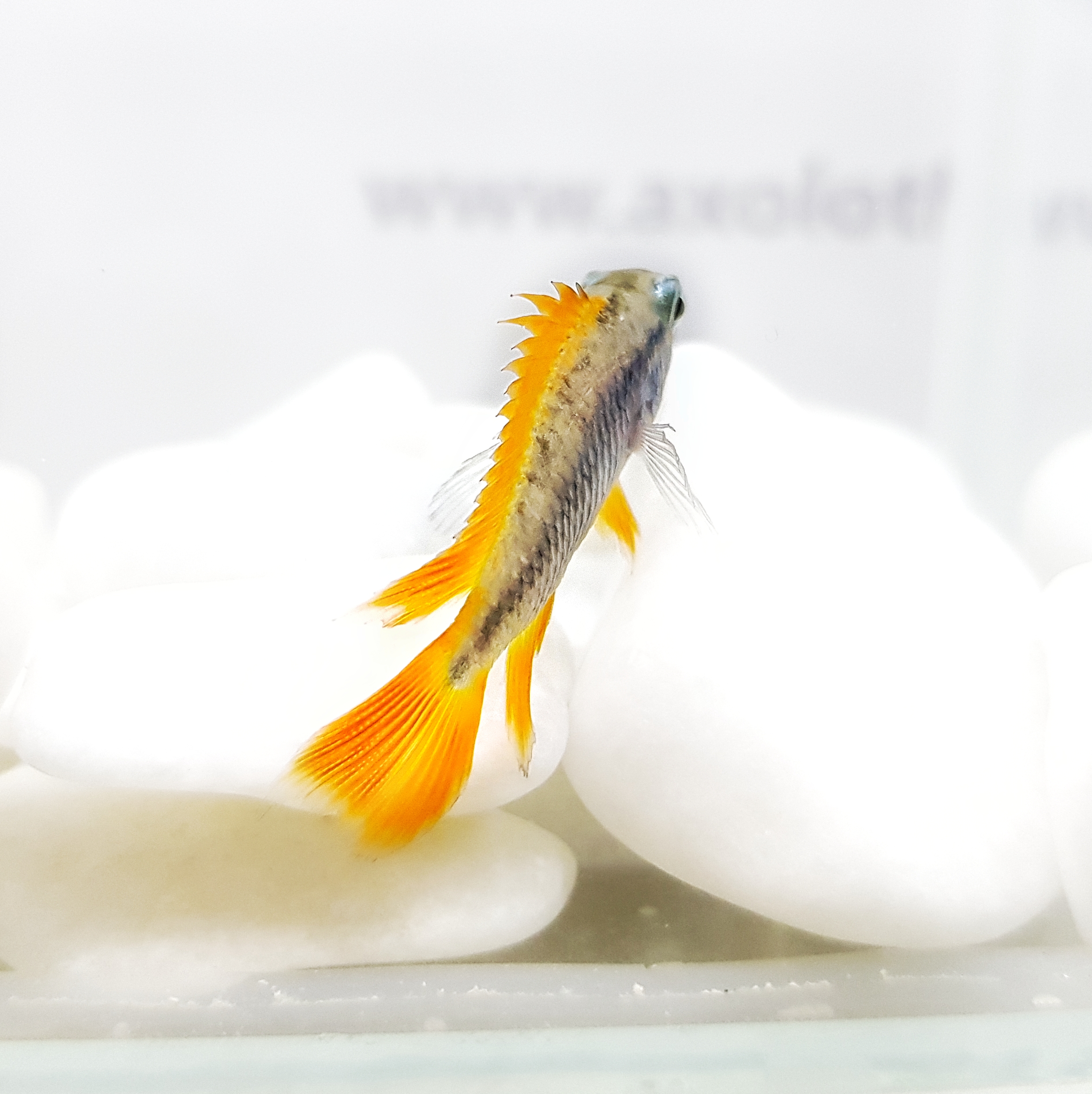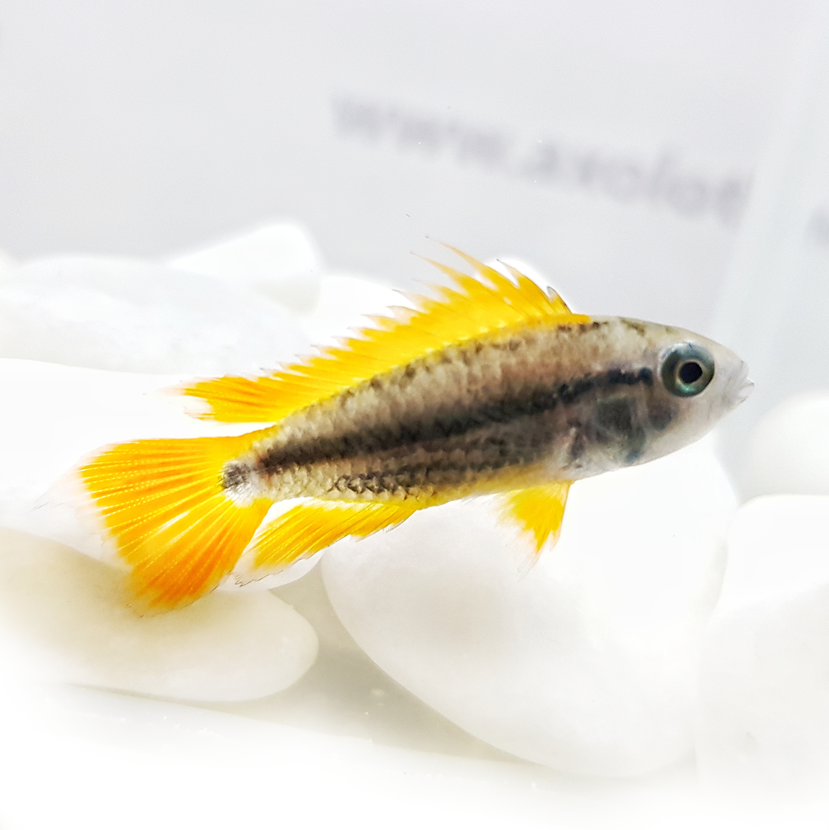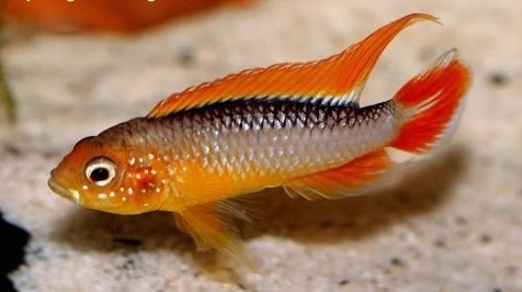 ОПИСАНИЕ Тело Агассица удлиненное со сравнительно низким спинным плавником. Передняя часть спинного плавника темная почти без мембран. Хвостовой плавник ланцетовидный у самцов, округлый у самок и подростков. По краю хвостового плавника проходит черная или красная полоса, под ней - белая полоса. От глаза до хвостового плавника проходит темная полоса шириной в 1 - 1,5 чешуйки. За грудными плавниками всегда присутствует маленькое темное пятно. На внешнем крае верхней губы металлически-голубое пятно. У самок в период заботы о потомстве может появляться темное пятно на хвостовом стебле и на брюшке. Размер самцов до 9 см., самки вырастают до 5 см. Половые различия: Самцы обычно крупнее самок в два раза. Спинной и анальный плавники у самцов часто нитевидно удлинены. Беловато-прозрачные брюшные плавники заострены и сильно увеличены, иногда так, что кончики их достают до основания хвостового плавника. У взрослых самцов хвостовой плавник заметно ланцетовиден и очерчен голубыми, белыми или красноватыми полосами. У самок хвостовой плавник округлый. Спинной, анальный и брюшные плавники округлые или слегка заострены, но никогда не увеличены. Передняя часть брюшных плавников у самок окрашена в черный или темно-серый цвет.
