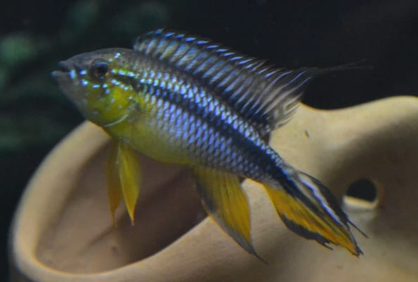ОПИСАНИЕ Тело Агассица удлиненное со сравнительно низким спинным плавником. Передняя часть спинного плавника темная почти без мембран. Хвостовой плавник ланцетовидный у самцов, округлый у самок и подростков. По краю хвостового плавника проходит черная или красная полоса, под ней - белая полоса. От глаза до хвостового плавника проходит темная полоса шириной в 1 - 1,5 чешуйки. За грудными плавниками всегда присутствует маленькое темное пятно. На внешнем крае верхней губы металлически-голубое пятно. У самок в период заботы о потомстве может появляться темное пятно на хвостовом стебле и на брюшке. Размер самцов до 9 см., самки вырастают до 5 см. Половые различия: Самцы обычно крупнее самок в два раза. Спинной и анальный плавники у самцов часто нитевидно удлинены. Беловато-прозрачные брюшные плавники заострены и сильно увеличены, иногда так, что кончики их достают до основания хвостового плавника. У взрослых самцов хвостовой плавник заметно ланцетовиден и очерчен голубыми, белыми или красноватыми полосами. У самок хвостовой плавник округлый. Спинной, анальный и брюшные плавники округлые или слегка заострены, но никогда не увеличены. Передняя часть брюшных плавников у самок окрашена в черный или темно-серый цвет.