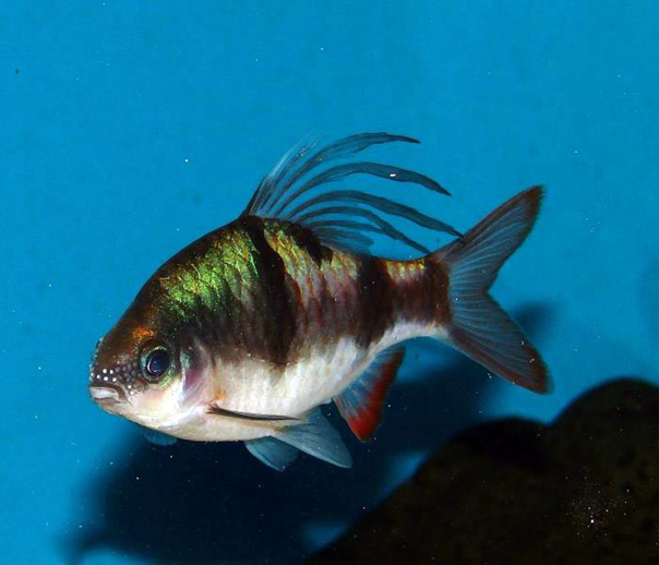 Барбус арулиус (Barbus arulius)Активная стайная рыба, самцы которой отличаются необычной формой спинного плавника. Подвижна, динамична, перемещается по всем горизонтам аквариума. Не рекомендуется содержать с малоподвижными рыбами, особенно вуалевыми формами. Предпочитает умеренное рассеянное освещение. Аранжировка водоема предусматривает использование жестколистной флоры, коряжника, темного грунта и камней. Максимальный размер - 12 см. Минимальный объем аквариума - 80-100 л на пару, но лучше использовать более просторные емкости вместимостью от 100л. Параметры воды: Т=20-26оС, dGH 4-15о, рН 6-7.