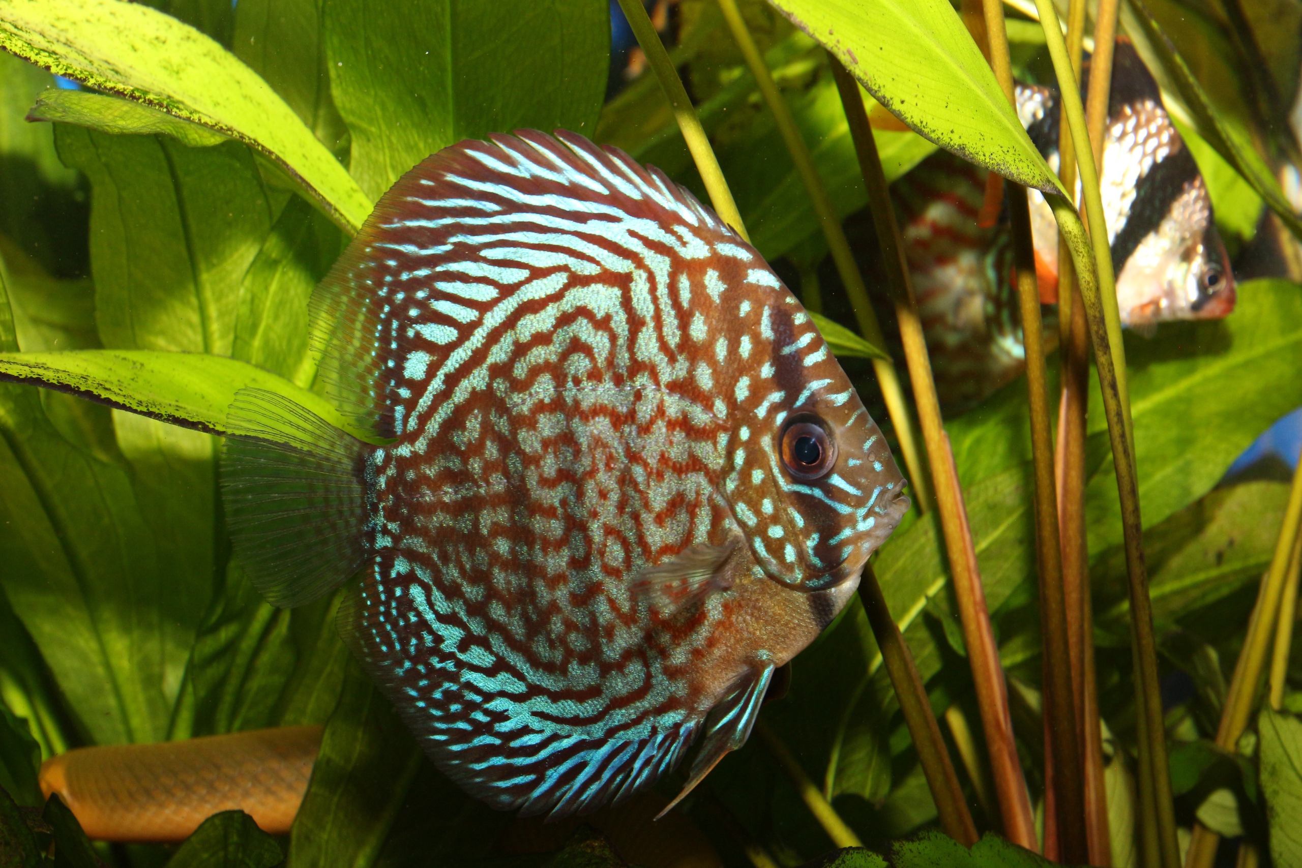 Если вы решили поселить к дискусам других рыб, то лучше, если это будут аквариумные питомцы со сходными условиями содержания. Например, панцирные сомики, коридорас панда, коридорас штерба или коридорас золотистый предпочитают жить при температуре до +34°С. Кроме того, эти рыбки будут доедать корм, который остался несъеденным дискусами. В условиях повышенной темcuidado-de-los-peces-discoпературы и интенсивного водообмена неплохо себя чувствует и парчовый птеригоплихтис, которого также можно подселить к дискусам. К тому же эта разновидность сомика хорошо очищает стекла аквариума. Существует определенная совместимость дискусов и с некоторыми другими рыбами, такими, как скалярия и красный неон, голубой конго и боций клоун, красноголовая тетра, яблочная улитка и различные креветки. В отличии от других цихлид, дискус мирная и очень уживчивая рыба. Они не хищные, и не роют грунт как многие цихлиды. Дискусы стайная рыба и предпочитают держаться в группах от 6 штук, и плохо переносят одиночество. Проблема в подборе соседей для дискусов в том, что они медленные, неторопливо едят и живут при достаточно высокой для других рыб температуре воды. Из-за этого, а так же что бы не заносить болезни, дискусов чаще всего содержат в отдельном аквариуме. Но, если вам все же хочется подселить к ним соседей, то совместимы они с: красные неоны, апистограмма Рамирези, боцию клоуна, красноносую тетру, конго, и различных сомов для того что бы держать аквариум в чистоте, например таракатума, сомов с присоской вместо рта лучше избегать, так как они могут нападать на дискусов.