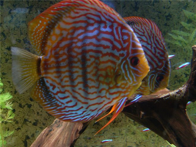 Если вы решились разводить дискусов, то их следует выращивать совместно, группой в 6-8 особей. Со временем рыбки разобьются на пары, которые в дальнейшем можно использовать для размножения. Для нерестилища потребуется мягкая слабокислая вода, чтобы количество оплодотворенной икры было достаточно большим. Минимальный объем нерестовика составляет 100 литров, при этом грунт и растения в нерестовике не нужны. Глиняные горшки или обрезки керамических труб в аквариуме послужат субстратом. Температура воды должна быть на уровне 30-32 градусов. Дискусы откладывают икру сезонами, поэтому в течение одного периода способны размножаться до 10 раз. Случается, что икра погDiscus_1ибает или съедается родителями. После этого наступает достаточно длительный перерыв. Однако дискусы могут размножаться в течение двух-трех лет, а половая зрелость у них наступает уже в возрасте одного года. За один нерест получается около 200 штук мальков, которых родители выкармливают секретом, выделяемым кожей. Если вы решили выкармливать мальков самостоятельно, то родителей необходимо удалить. Кормить молодь следует с 5-6 дня науплиями артемии. По мере роста мальков можно использовать любые качественные корма, подходящие по размерам. Как видите, дискусы – довольно интересные рыбки со своими требованиями и повадками. Однако если вы готовы ухаживать за ними и соблюдать все рекомендации, то в благодарность дискусы подарят вам массу позитивных эмоций.