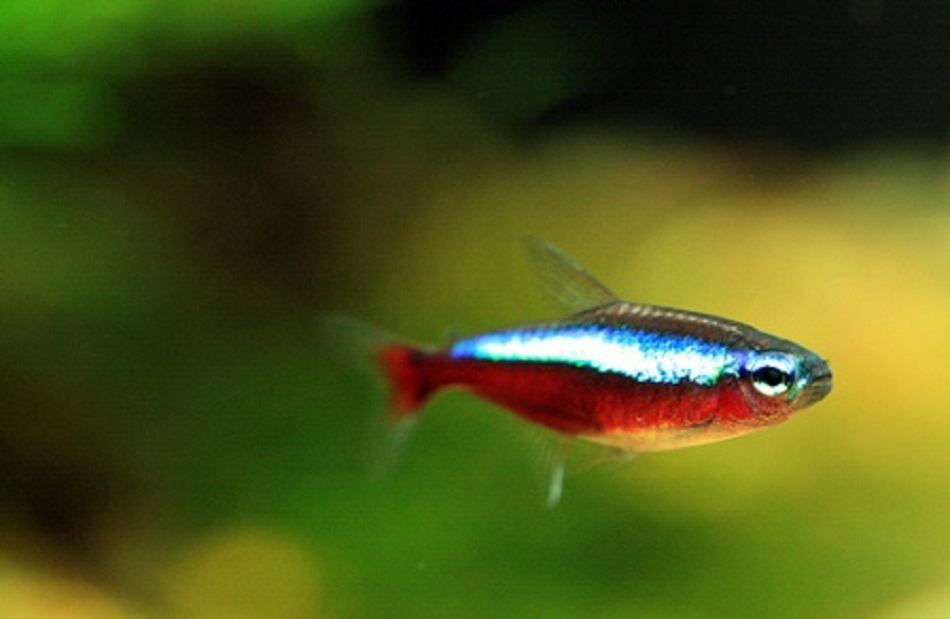 ОПИСАНИЕ Красный неон выделяется наиболее яркой окраской из всех неонов. Эти рыбки чуть крупнее обычных неонов и достигают 5 сантиметров длины. Красный неон имеет довольно вытянутое, несколько уплощенное с боков тело. По всему телу от головы до самого хвостового плавника проходит ярко-голубая полоска. При взгляде на эту полоску создается впечатление, что она светится. Нижняя часть тела и брюшко у красных неонов интенсивно-красного, насыщенного цвета. Спинка фиолетово-серого оттенка, иногда с зеленым отливом. Глаза переливаются зелено-голубым блеском Все плавники у красных неонов прозрачные, лишь спинной и анальный имеют молочно-белую или голубоватую окантовку. Отдельные лучи хвостового плавника могут иметь красный цвет. Половые различия: самки полнее самцов, край анального плавника у них вогнут, а у самца слегка выпуклый. Самки вырастают до 5 см, самцов до 2,5—3,0 см.