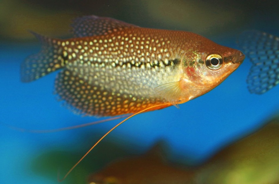 ОПИСАНИЕ: Рыбка характерна высоким, немного вытянутым в длину и сжатым с боков телом. На общем серебристо-фиолетовом фоне тела рыбки расположены отливающие жемчугом пятнышки. Два жаберных плавника, спинной и хвостовой, производят впечатление тюлевых и имеют такой же жемчужный блеск, как и тело. Во время нереста фиолетовый цвет становится гуще, жемчужные точки приобретают яркий блеск — «горят». Самцы жемчужного гурами имеют ярко-оранжевые горло и переднюю часть груди и кофейно-коричневую спину. У самцов спинной плавник заострен на конце, у самок спинной плавник закруглен. Вырастают до 10 см.
