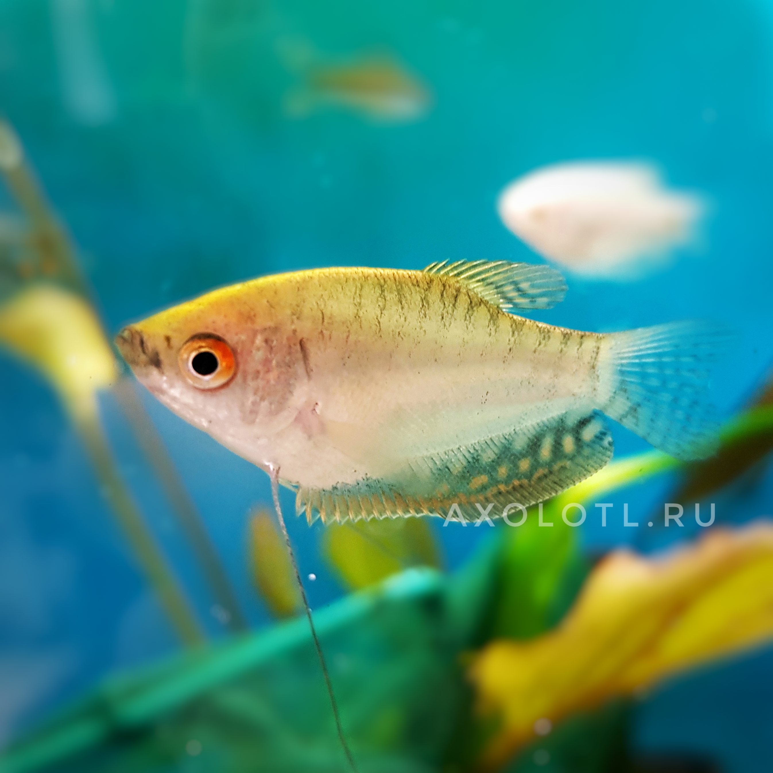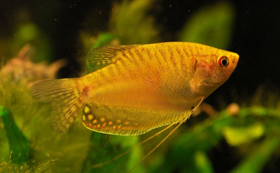 ОПИСАНИЕ: Рыбка характерна высоким, немного вытянутым в длину и сжатым с боков телом. Тело гурами окрашено в золотисто-желтый цвет с оранжевым оттенком. Спинной и анальный плавники длинные, невысокие.