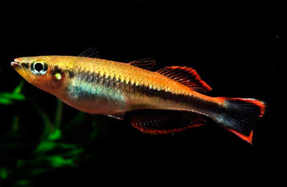 ОПИСАНИЕ Тело сильно вытянуто в длину, верхняя его часть - желтовато-оливковая, нижняя - латунно-желтая. Самец ярче окрашен, его спинной, хвостовой и анальный плавники имеют красную окантовку. Могут вырасти до 12 см.