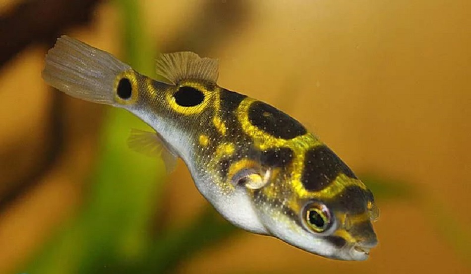 Тетраодон Восьмерка считается наиболее спокойным из своего семейства. Основной окрас спины - желтовато-зеленый с темными пятнами и линиями, среди которых можно рассмотреть цифру 8.