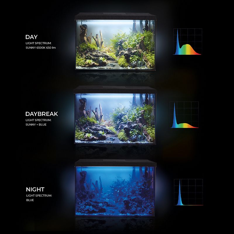 • для любителей флуоресцирующих рыб и декораций, которые эффектно меняют цвет в синем свете режима NIGHT;
