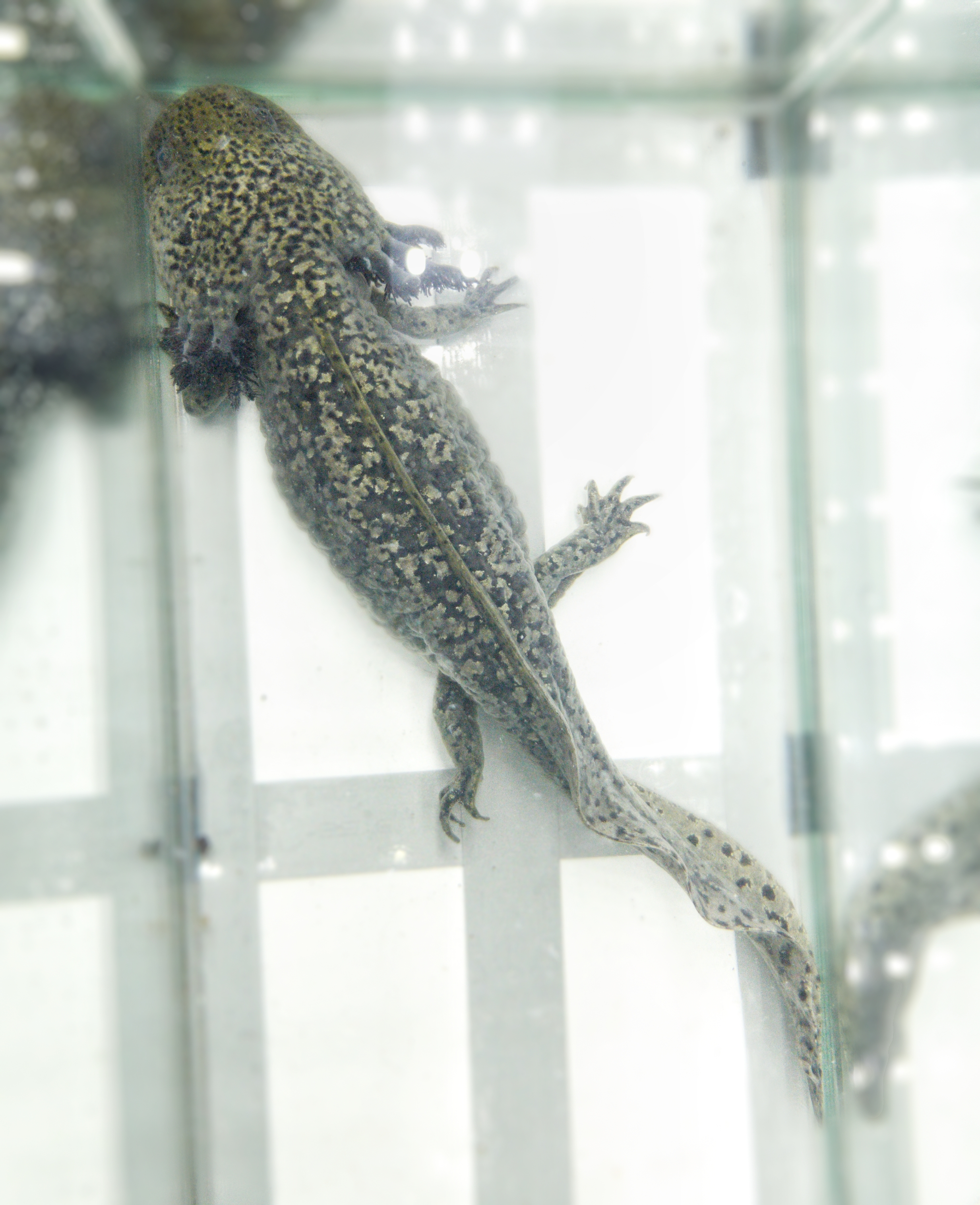 Сортировка. В период роста аксолотлей необходимо сортировать по величине. Аксолотлей достигших длины 7-10 см, что обычно бывает в конце второго месяца после начала активного питания, переводят в более просторные аквариумы, оборудованные фильтрами для воды. В аквариуме 1000/600/300 см можно поместить 70-100 особей. Уход состоит в ежедневной замене воды, удалении отходов и в ежедневном кормлении. Годовалых аксолотлей в таких аквариумах лучше держать не более 30 штук и постепенно переводить на кормление два раза в неделю.